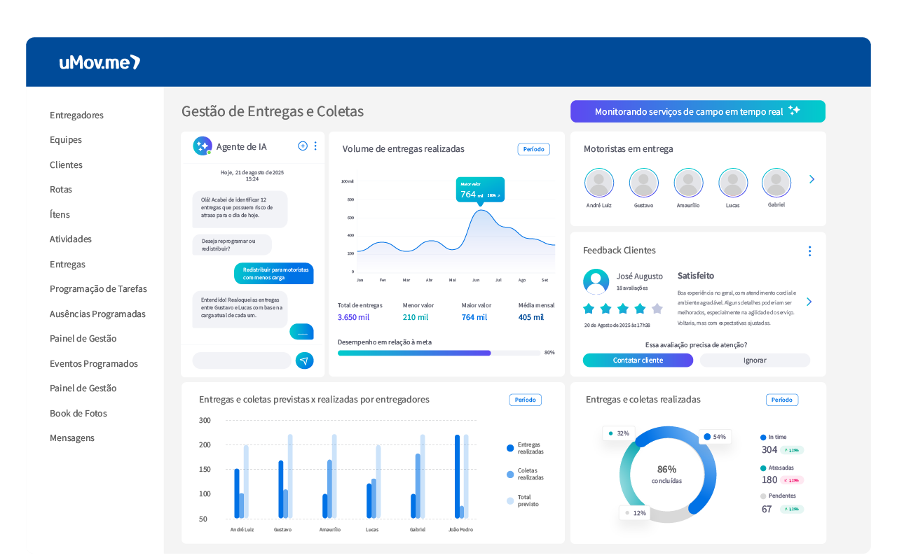 Painéis com multiagentes de IA que mantêm o gestor presente em campo, antecipando falhas e acompanhando a operação com visão estratégica.